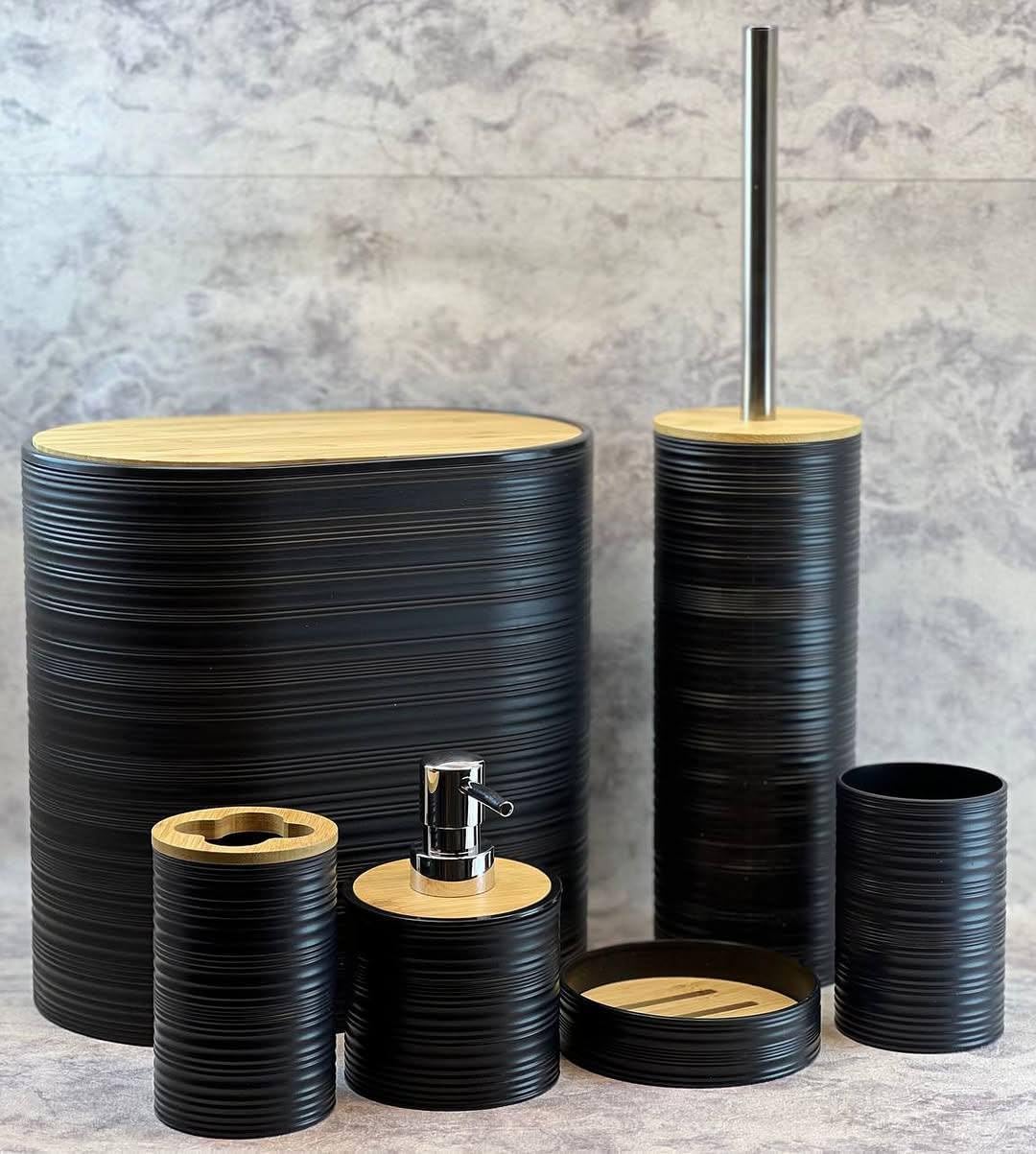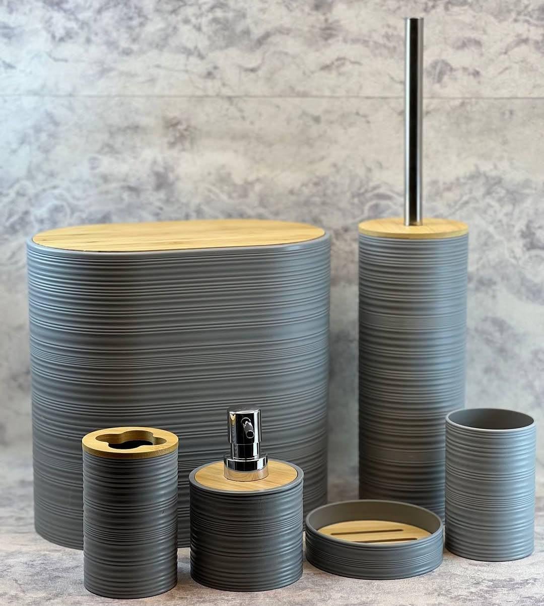 Donnez à votre salle de bain une finition élégante et coordonnée avec cet ensemble d’accessoires pour salle de bain. Composé d’un distributeur de savon, d’un porte-brosse, d’un gobelet, d’un porte-savon, d’une poubelle compacte et d’un porte-balai WC, cet ensemble allie design texturé moderne et plateau en bambou pour une touche naturelle.